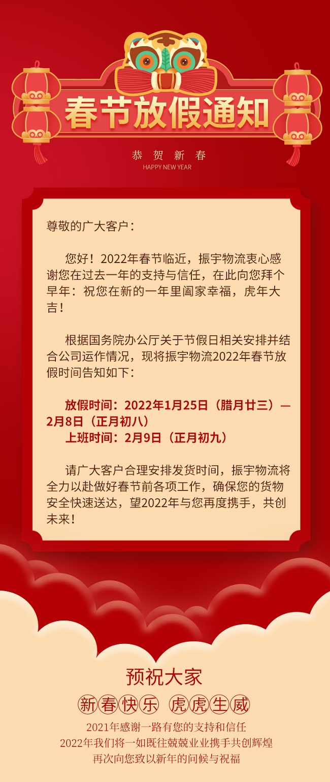 您好!2022年春節(jié)臨近,振宇物流衷心感謝您在過(guò)去一年的支持與信任,在此向您拜個(gè)早年:祝您在新的一年里闔家幸福,虎年大吉!