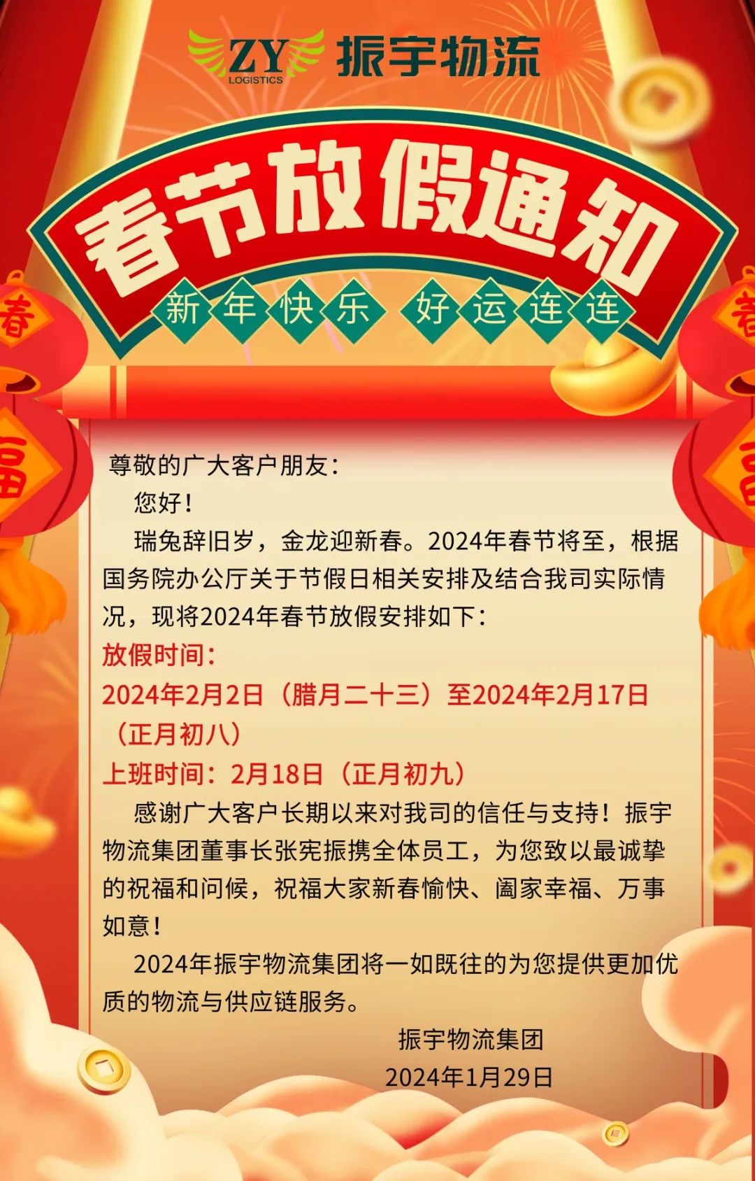 振宇物流集團丨2024年春節(jié)放假通知
