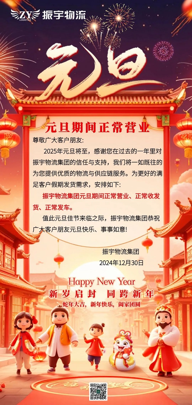 2025年元旦將至,感謝您在過(guò)去的一年里對(duì)振宇物流集團(tuán)的信任與支持,我們將一如既往的為您提供優(yōu)質(zhì)的物流與供應(yīng)鏈服務(wù)。為更好的滿足客戶假期發(fā)貨需求,安排如下: