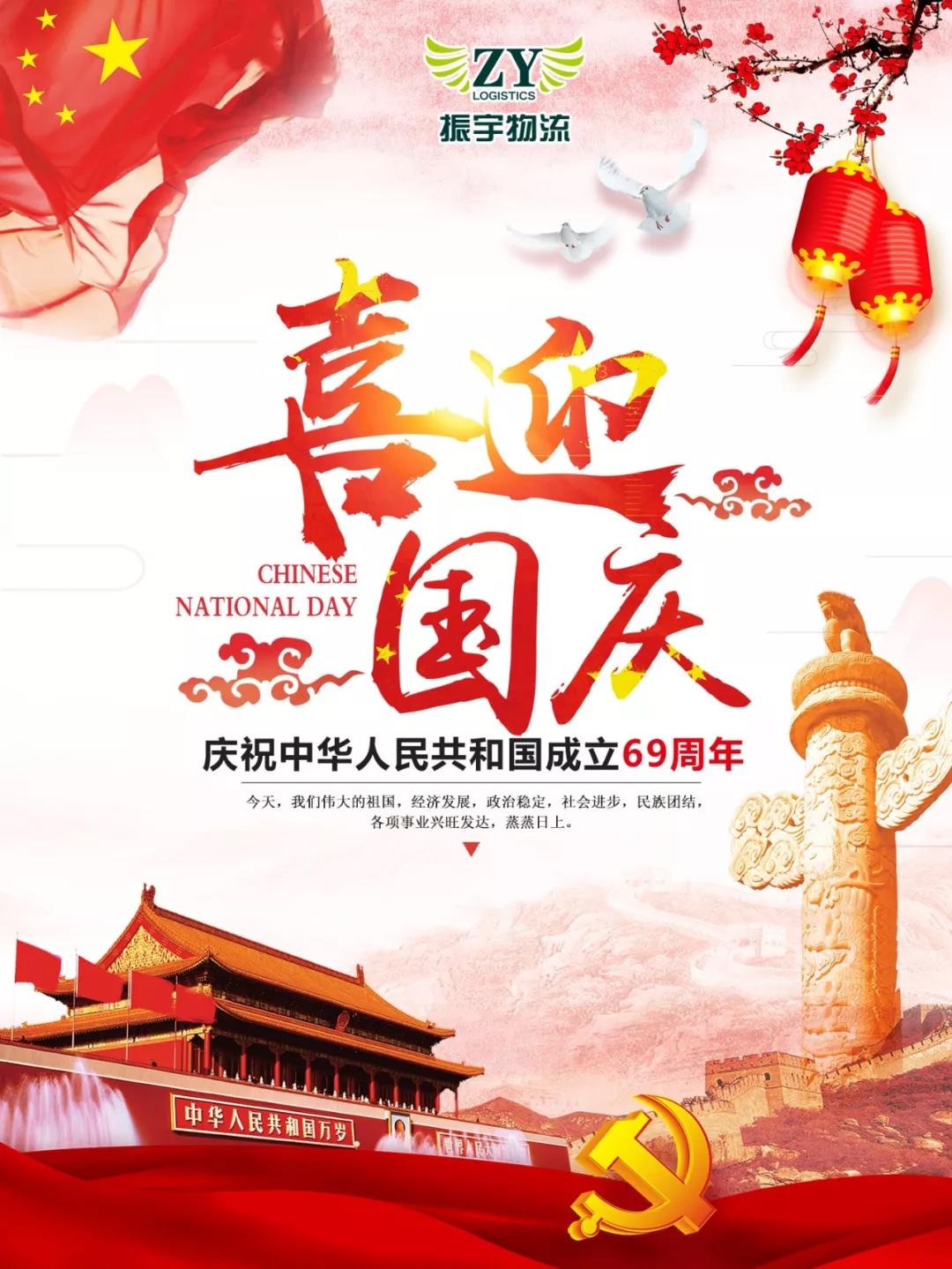 您好!感謝您們多年以來(lái)對(duì)振宇物流的鼎力支持,在2018國(guó)慶節(jié)即將來(lái)臨之際,振宇物流全體員工祝您國(guó)慶快樂(lè)!