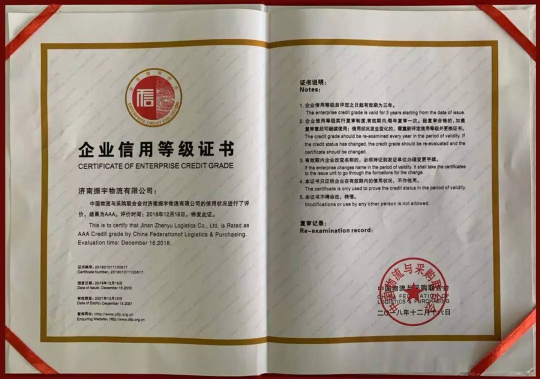 國家3A級信用企業(yè)是公司的一張對外名片,更是榮譽的代表。振宇物流始終專注自律,樹立誠信企業(yè)品牌形象,此次榮獲3A級信用企業(yè)證明了其自身具備的巨大實力。