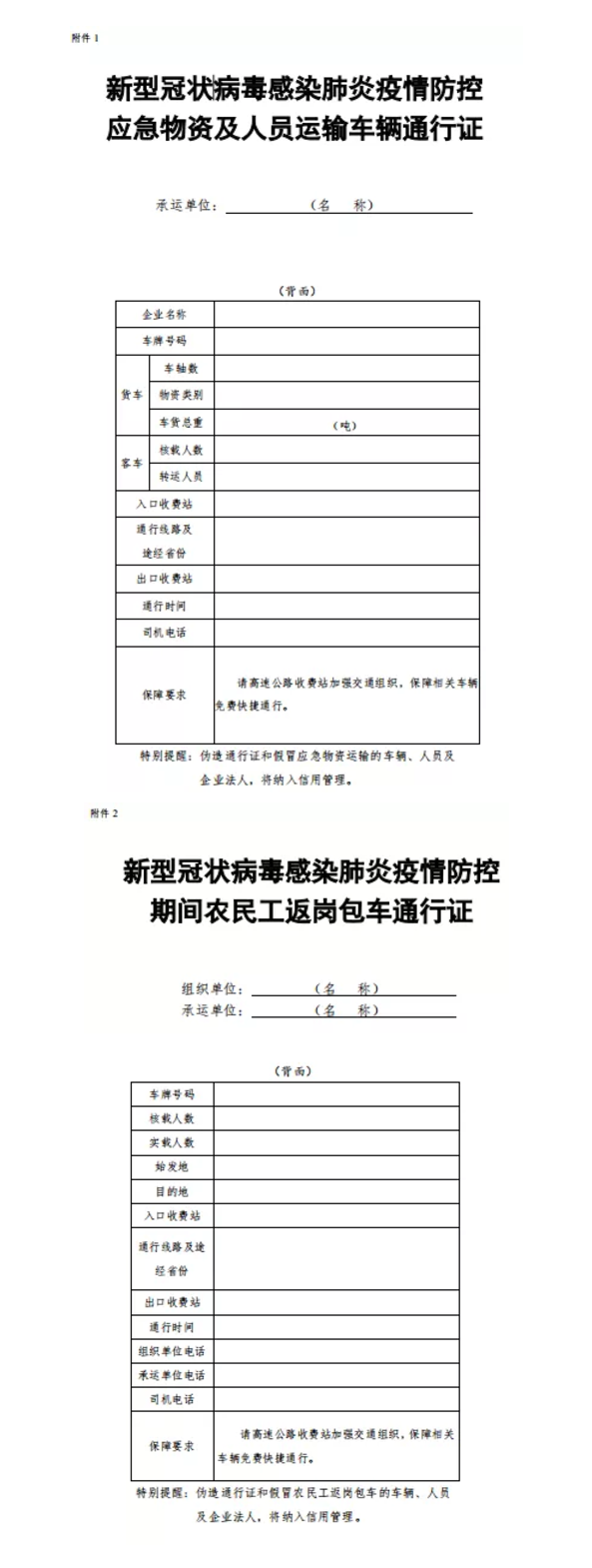 通知要求,地方各級(jí)交通運(yùn)輸部門要認(rèn)真落實(shí)《交通運(yùn)輸部關(guān)于切實(shí)保障疫情防控應(yīng)急物資運(yùn)輸車輛順暢通行的緊急通知》和《交通運(yùn)輸部關(guān)于疫情防控期間免收農(nóng)民工返崗包車公路通行費(fèi)的通知》要求,切實(shí)簡化“新型冠狀病毒感染肺炎疫情防控應(yīng)急物資及人員運(yùn)輸車輛通行證”(簡稱“車輛通行證”)、“新型冠狀病毒感染肺炎疫情防控期間農(nóng)民工返崗包車通行證”(簡稱“包車通行證”)辦理流程,通過政府網(wǎng)站、微信、電子郵件等便捷方式提供“車輛通行證”“包車通行證”統(tǒng)一式樣,供承運(yùn)單位或駕駛?cè)嗽诒镜刈孕写蛴 ⒆孕刑顚憽?/span>