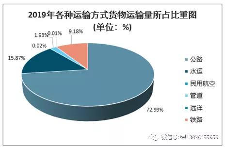 從貨物運(yùn)輸?shù)姆绞嚼矗愤\(yùn)輸仍然占據(jù)著我國貨物運(yùn)輸行業(yè)的主導(dǎo)地位。2019年各種貨運(yùn)運(yùn)輸量中公路運(yùn)輸量占比最大,達(dá)到了72.99%;其次為水運(yùn),占比為15.87%;鐵路運(yùn)輸量占比9.18%,位居第三。我國民航運(yùn)輸業(yè)起步較晚,仍處于發(fā)展階段,貨機(jī)數(shù)量整體來說相對(duì)較少,這導(dǎo)致2019年民航貨運(yùn)量占比僅有0.02%。