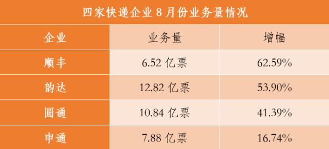 9月18日晚間,順豐控股、圓通速遞、韻達(dá)股份和申通快遞四家企業(yè)發(fā)布8月經(jīng)營(yíng)簡(jiǎn)報(bào)。數(shù)據(jù)顯示,四家快遞企業(yè)繼續(xù)保持高速增長(zhǎng)。其中,順豐業(yè)務(wù)量增幅繼續(xù)領(lǐng)跑,韻達(dá)連續(xù)五個(gè)月、圓通連續(xù)四個(gè)月單月業(yè)務(wù)量破10億票。