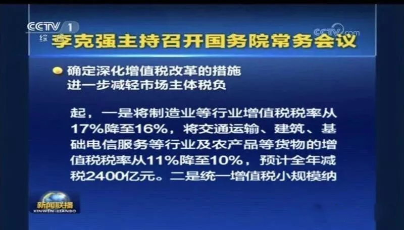 會議指出,過去五年通過實施營改增累計減稅2.1萬億元。按照黨中央、國務(wù)院部署,為進(jìn)一步完善稅制,支持制造業(yè)、小微企業(yè)等實體經(jīng)濟(jì)發(fā)展,持續(xù)為市場主體減負(fù),會議決定,從2018年5月1日起,一是將制造業(yè)等行業(yè)增值稅稅率從17%降至16%,將交通運(yùn)輸、建筑、基礎(chǔ)電信服務(wù)等行業(yè)及農(nóng)產(chǎn)品等貨物的增值稅稅率從11%降至10%,預(yù)計全年可減稅2400億元。